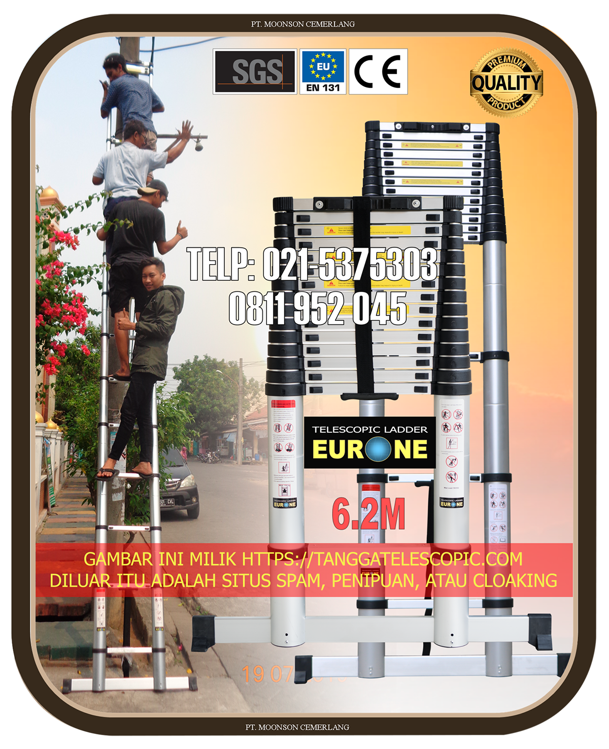 Tangga telescopic ini telah memenuhi European Union Safety Standard, atau dikenal dengan sertifikasi EN-131 (KLIK DISINI). Dengan kemampuan menahan beban hingga 150 kg, sudah lebih dari cukup untuk anda semua. Tersedia beberapa ukuran tinggi maximal: 2.6m, 3.2m, 3.8m, 4.1m, 4.4m, dan 5m, 5.4m, dan 6.2m. Tangga telescopic lurus dengan ketinggian di atas 5 meter dilengkapi dengan stabilizer berupa bottm bar agar lebih stabil saat digunakan. Hati-hati dengan produk tangga telescopic berkualitas rendah yang hanya mengejar harga murah tanpa memperdulikan soal kenyamanan dan keamanan.