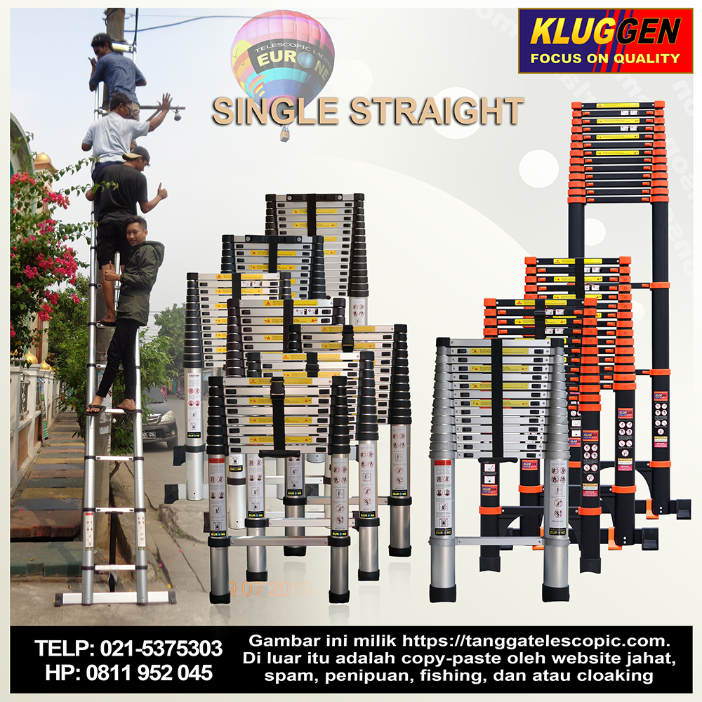 Tangga telescopic seringkali dibutuhkan dalam kehidupan kita sehari-hari. Tetapi pada umumnya tangga lebih banyak disimpan daripada digunakan. Apabila anda masih menggunakan tangga konvensional, sadar atau tidak, sebenarnya selama itu pula anda telah direpotkan dalam hal penyimpanan tangga karena bentuknya yang besar hingga benar-benar memakan tempat. Begitu juga saat hendak digunakan dan dibawa-bawa, sungguh repot- walaupun sudah terlipat. Kini telah hadir tangga telescopic untuk menjawab masalah tersebut. Tangga bisa ditarik hingga panjang, dan bisa pula ditekan hingga ke bentuk yang pendek dan ringkas sehingga mudah dibawa kemana-mana atau disimpan. Berikut kami perkenalkan salah satu variannya tangga telescopic single (single straight telescopic ladder), atau disebut juga tangga telescopic lurus.