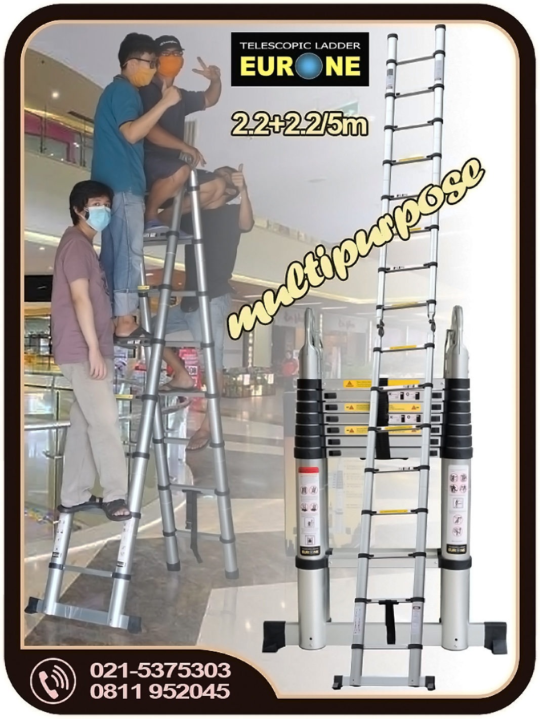 Sudah menjadi umum bahwa tangga aluminium berbentuk segitiga disebut juga tangga lipat. Jadi yang sedang kita bahas ini tidak lain adalah juga tentang tangga lipat 2 meter. Sekali lagi meskipun membutuhkan ketinggian panjat 2 meter tetapi tangga yang dibutuhkan harus lebih tinggi. Pada gambar ke-3 ini adalah tipe Multipurpose 2.5+2.5m/5m. Artinya secara segitiga tinggi maksimum tangga adalah 2,5 meter; dan bila dibentang lurus akan mencapai 5 meter. Mengingat anak tangga paling atas jenis ini tidak persis pada puncaknya, melainkan turun 20 cm, maka ketinggian tangga secara segitiga hanya 2,3 cm- belum lagi reduksi karena kemiringan. Penggunaan yang lebih tinggi, yakni tangga lipat 3 meter, juga cocok digunakan untuk rumah-rangga dan kantor. Mudah-mudahan informasi ini berguna sebagai bahan pertimbangan saar hendak membeli tangga portable 2 meter. Yang pasti, kami sarankan untuk mulai beralih ke jenis teleskopik karena bukan saja super ringkas tetapi juga tingginya sangat fleksibel, bisa diatur sesuai kebutuhan.
